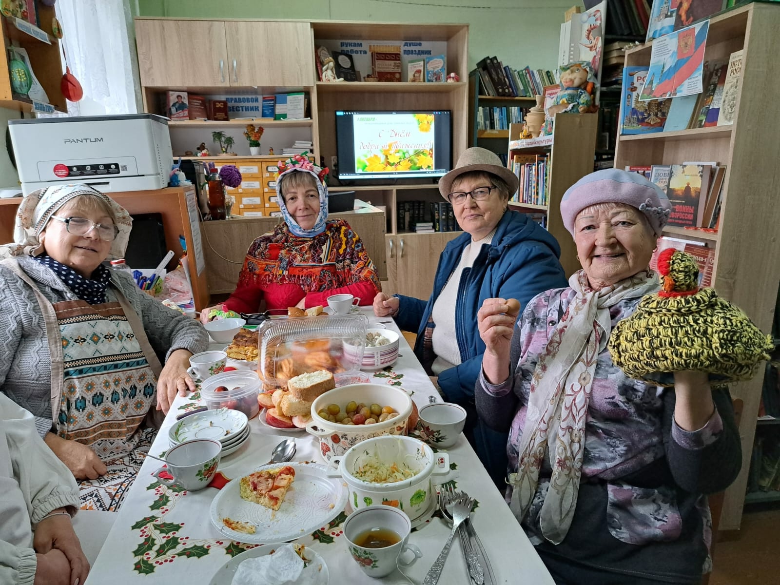 В теплой дружеской обстановке, за чашкой чая, вспомнили пословицы и поговорки о старости, поделились рецептами сохранения здоровья, красоты и бодрости, которые всегда можно найти в журналах и книгах фонда библиотеки, обыграли сказку "курочка ряба" о семейных ценностях, попели всем знакомые песни с помощью караоке.